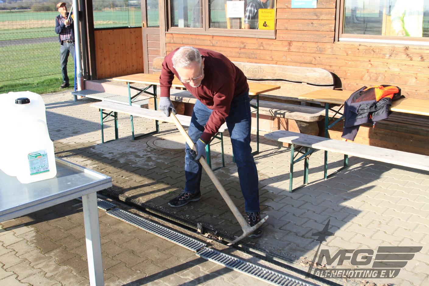 Ein weiterer Trupp reinigte die Wasserablaufrinnen vor der Hütte, weitere machten sich daran die beiden Container vom Staub zu befreien.