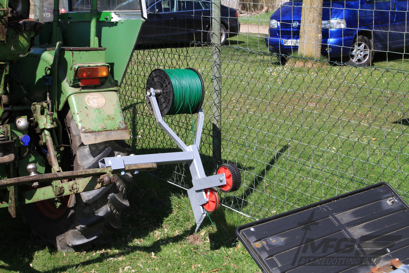 Das schon vielfach geflickte Begrenzungskabel für den Rasenroboter wurde entfernt und durch ein neues, stärkeres Kabel ersetzt. Mit einer selbst erarbeiteten Kabellegevorrichtung konnte das neue Kabel eingearbeitet werden. In stundenlanger Tüftelarbeit hat Richard seine Vorrichtung letztlich an den Traktor montiert. Super!