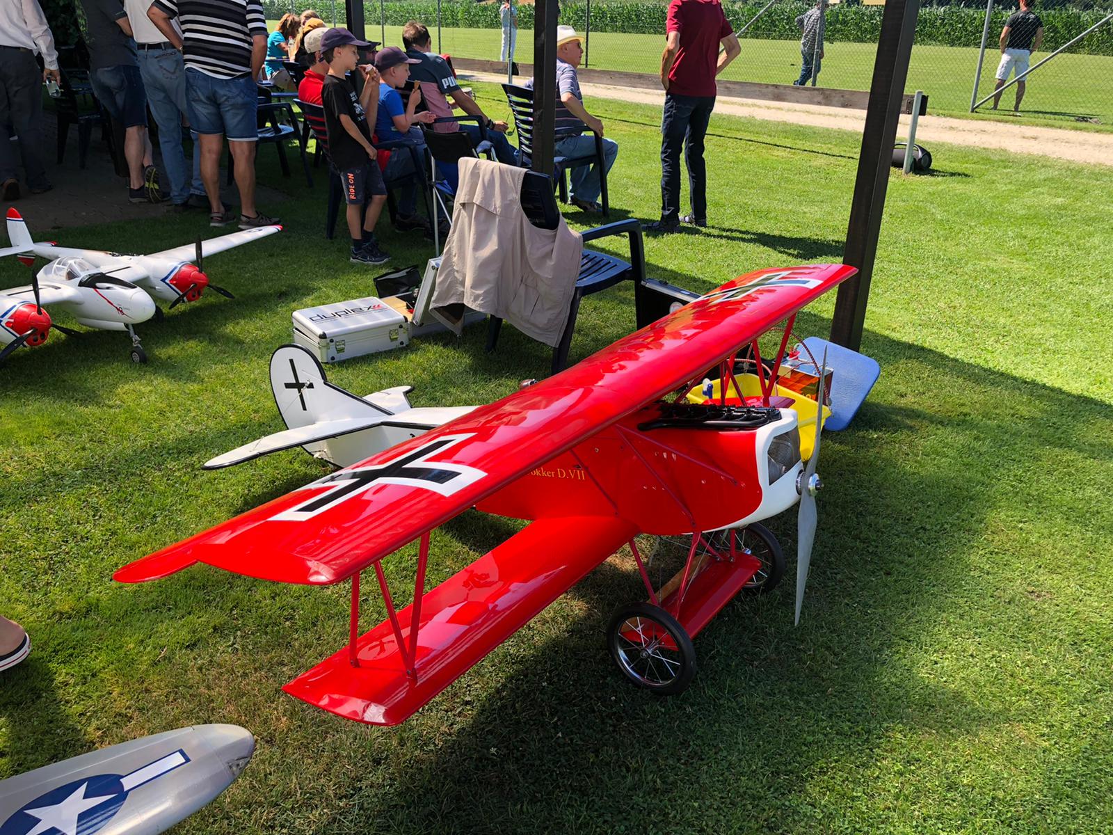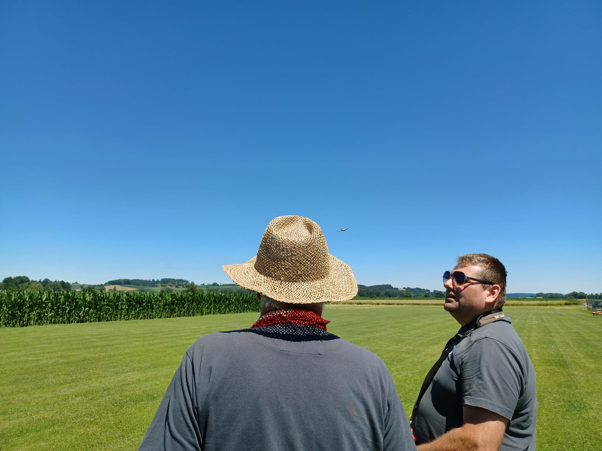 Bereits früh haben uns unsere Mettenheimer Fliegerkollegen zu ihrem Jubiläumsfest eingeladen. Wir folgten dem Ruf mit einer stattlichen Anzahl von Piloten und Modellen. Bereits um 10:00 Uhr versammelten sich die ersten Gäste um das Clubhaus der Mettenheimer Modellflieger. Mit einem riesigen Propeller und einem schweren Geschenkkorb konnte Richard unsere Aufwartung machen. Schwer war er, wäre er doch mit unserem Vorstand bei der Übergabe fast zu Boden gegangen.