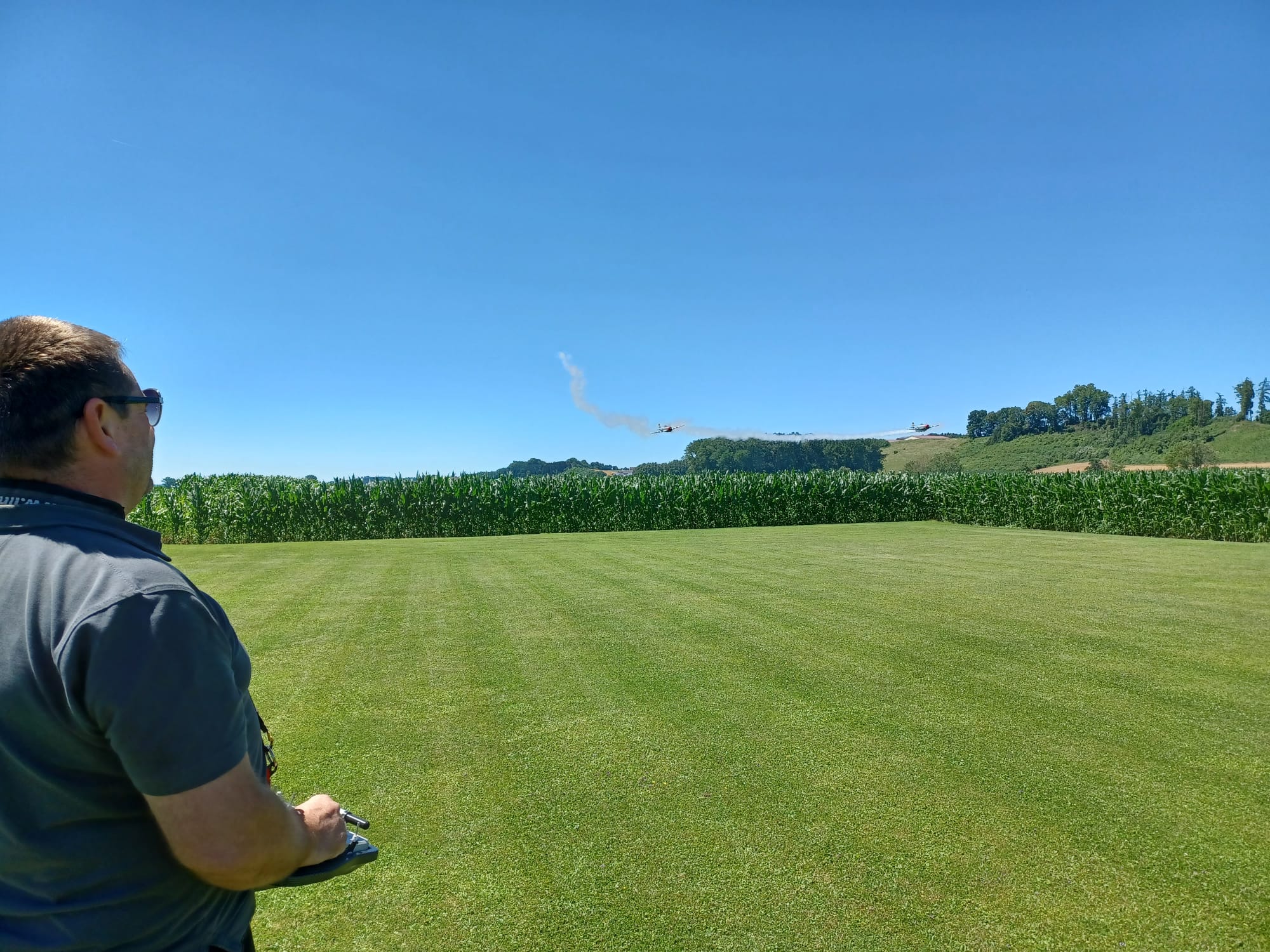 Flugbetrieb herrschte den ganzen Tag. Auch wenn Schrauber immer etwas zu tun haben! Letztlich konnten auch alle Rauchpumpen zu Laufen gebracht werden und die kleine P47-Staffel zeichnete ihre Flugbahn in den wolkenlosen Himmel.