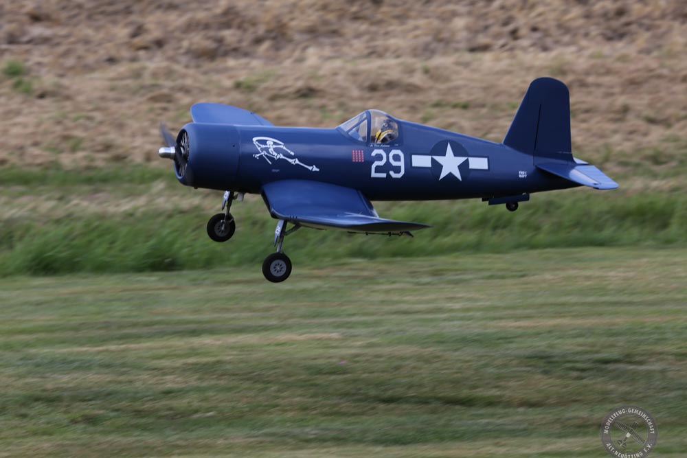 Der Samstag war dann wie jedes Jahr mit Trainingsflügen voll gefüllt. Vom einfachen Schaumflieger bis hin zu einer Corsair mit 3,10 Metern Spannweite und einem Abfluggewicht von 30 kg war alles was der Flugmodellsport zu bieten hat vertreten.