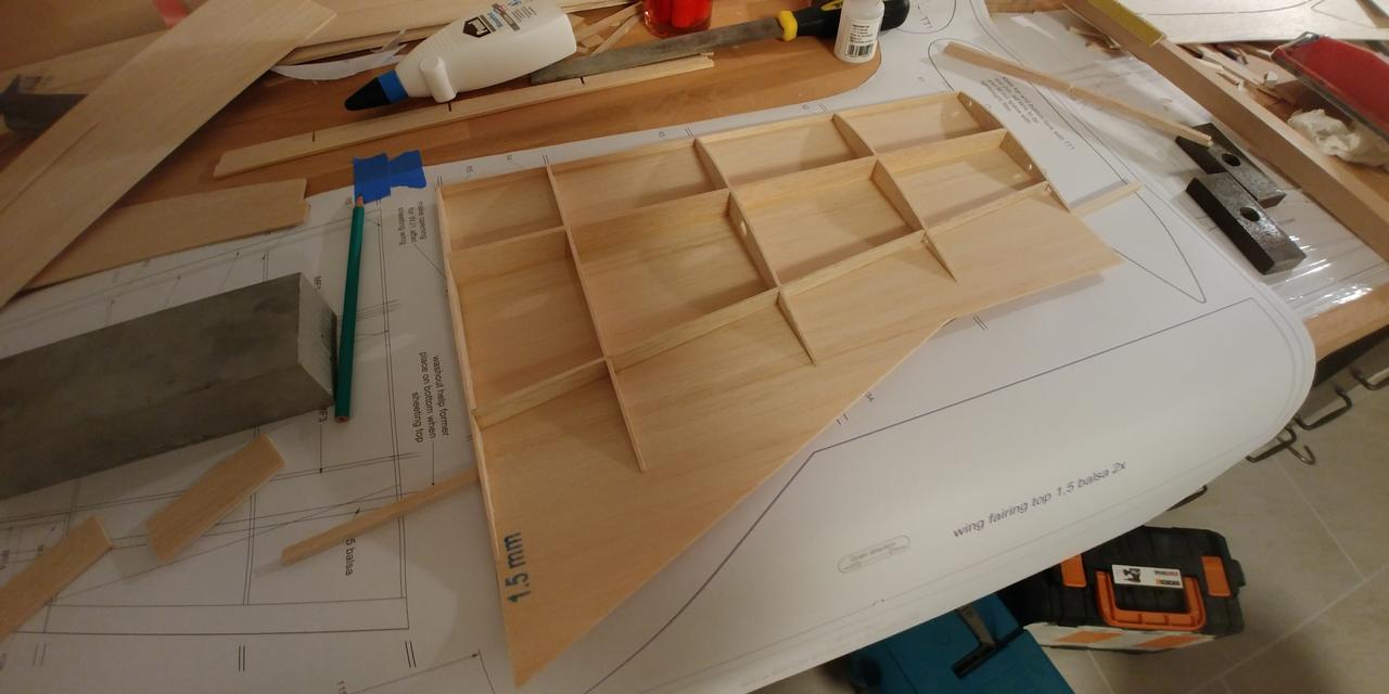 Die Fläche war sehr schnell auf zwei Abende gebaut. Abend eins: Unterseite und Rippen. Abend zwei: Oberseite und schleifen. Etwas in die länge gezogen wurde der Bauabschnitt jedoch von den Querrudern. (Passgenauigkeit...) Dazu nur: Schleifen, spachteln, schleifen, spachteln, ....