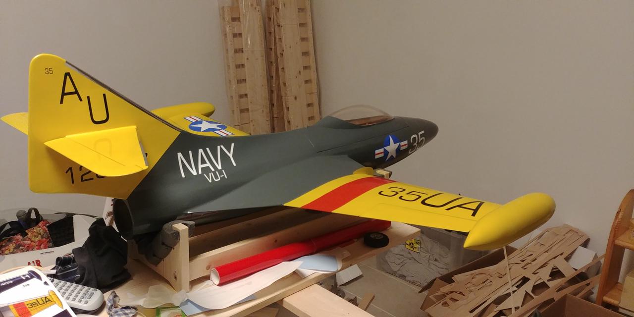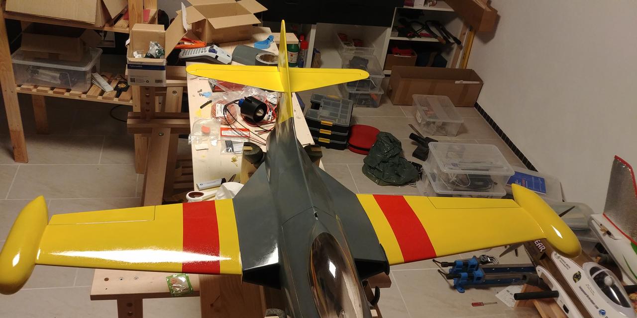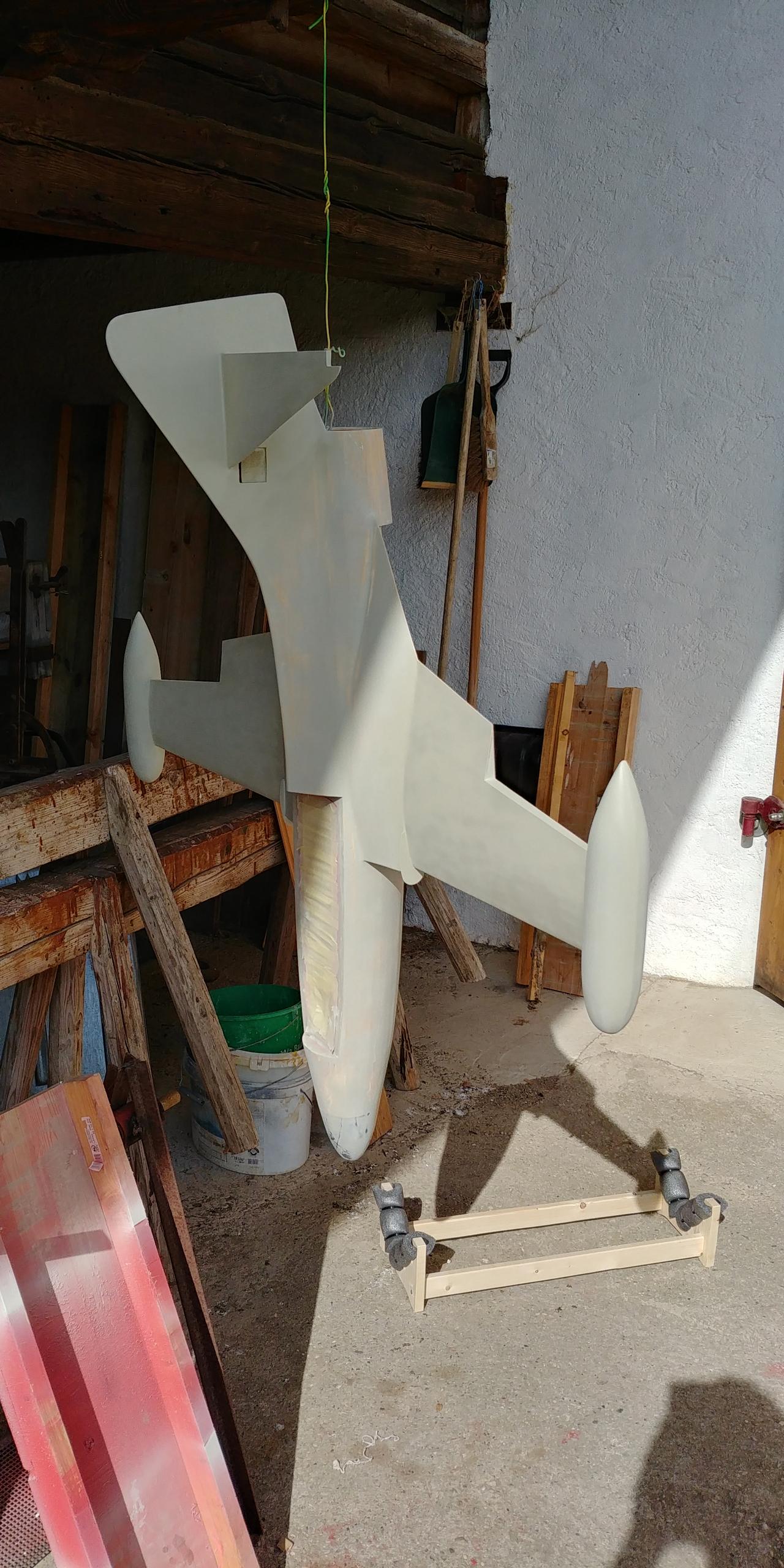 Zuerst die Unterseite und am nächsten Tag dann die Oberseite. (Wichtig ist nichts vergessen: Rumpf, Tragfläche, Querruder, Höhenruder, Impeller-Abdenkung und Kanzel, sonst heißt´s nachsitzen.)