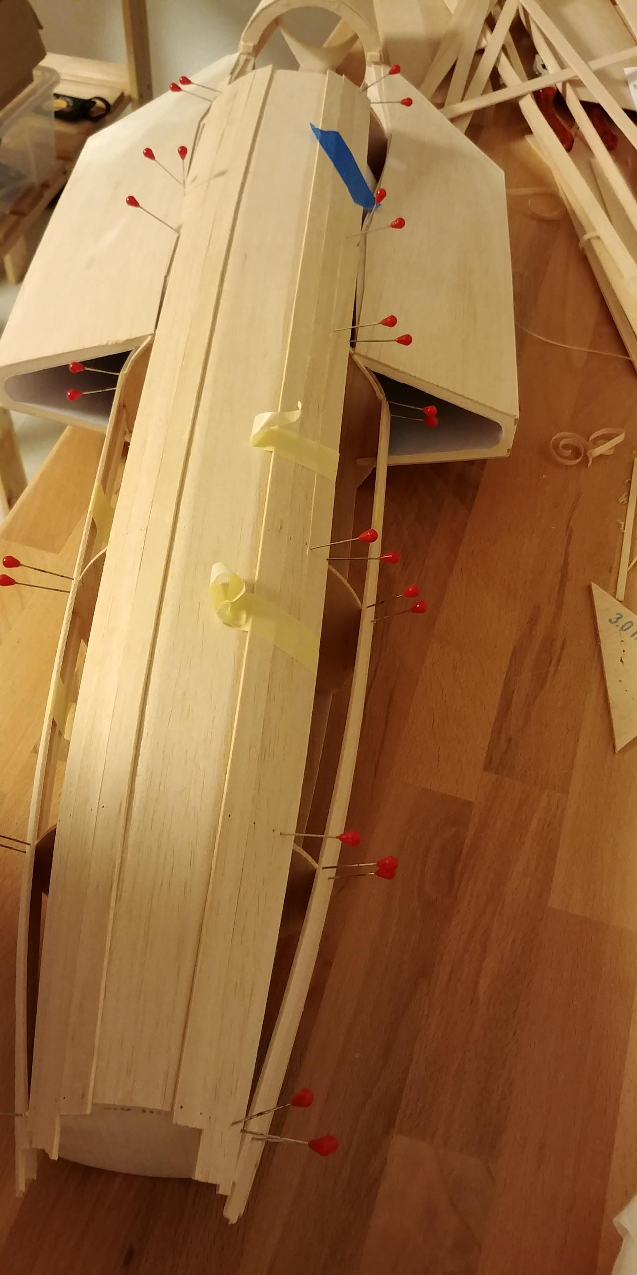 Weiter ging es mit dem Beplanken.... Tausende von kleinen leisten rund um den Rumpf biegen. Und im Anschluss schleifen, schleifen, schleifen, schleifen, schleifen, schleifen. Ach und dann schleifen!