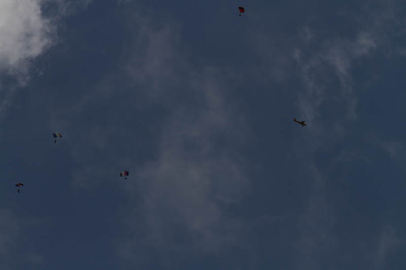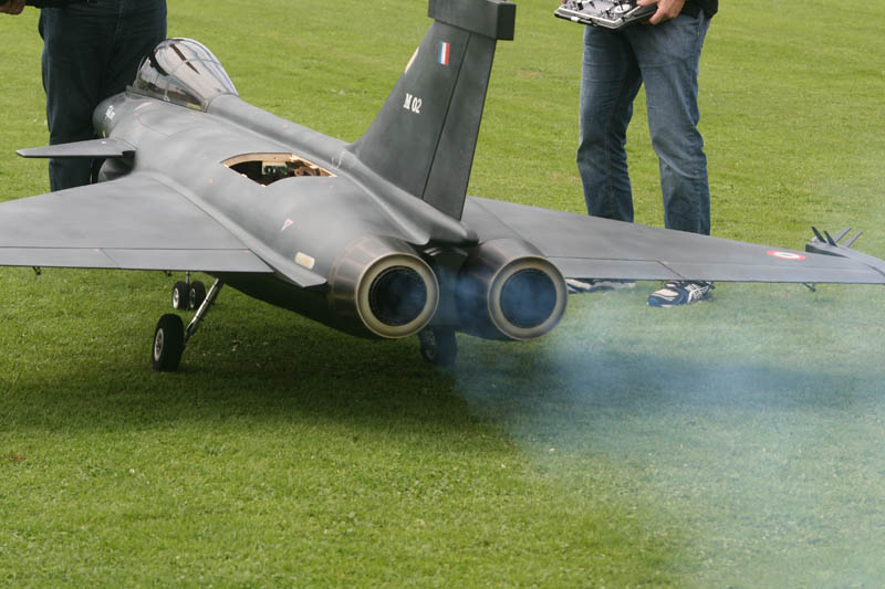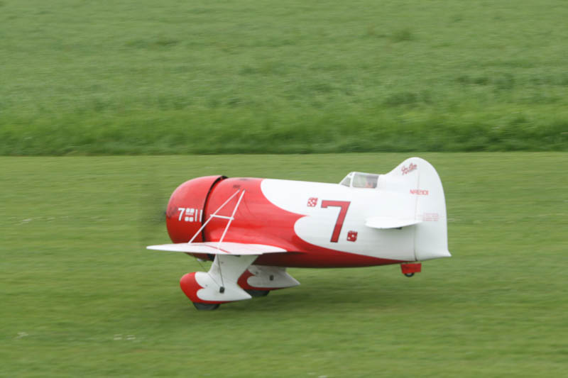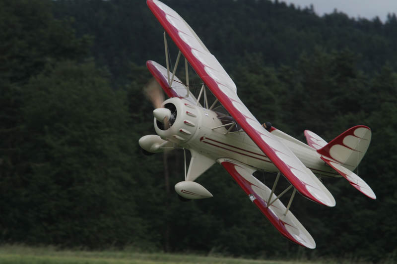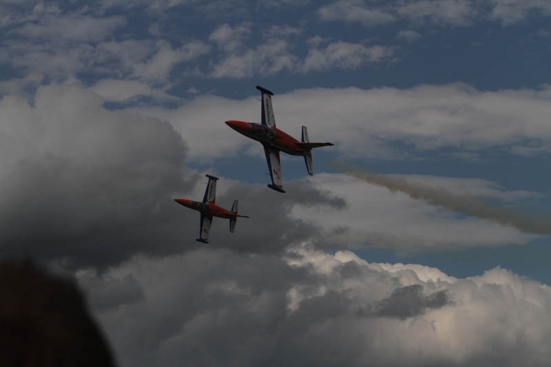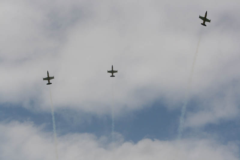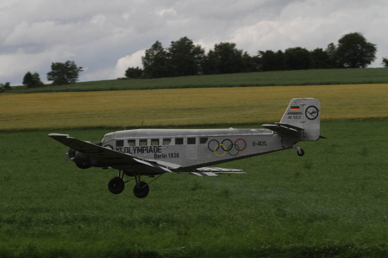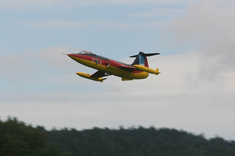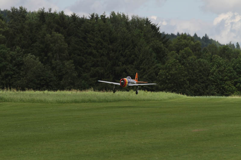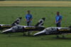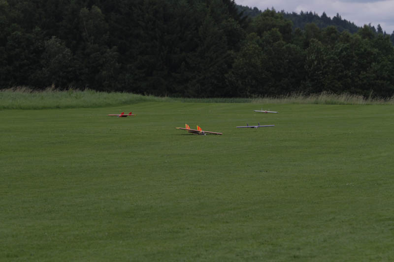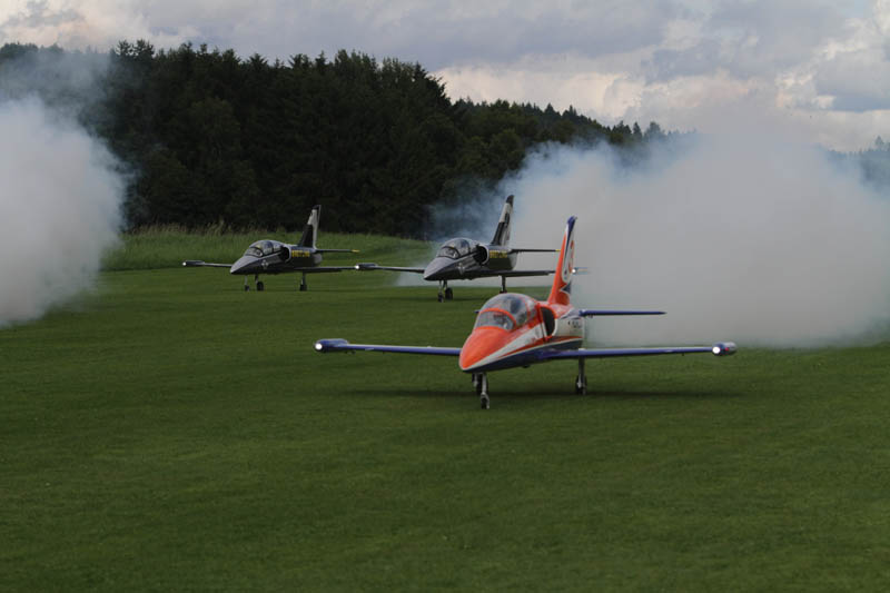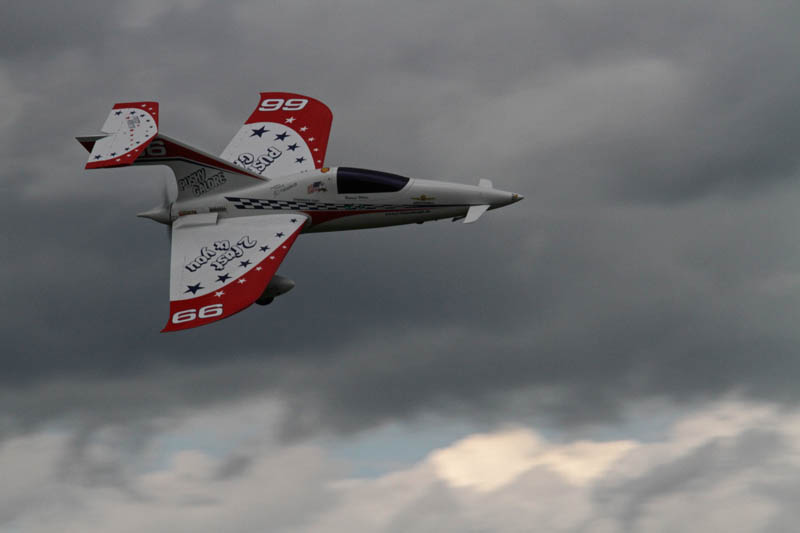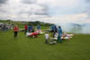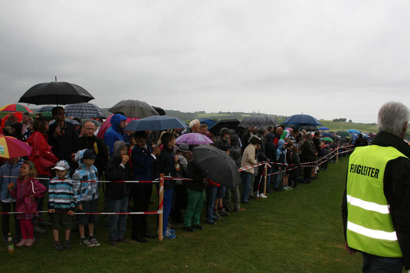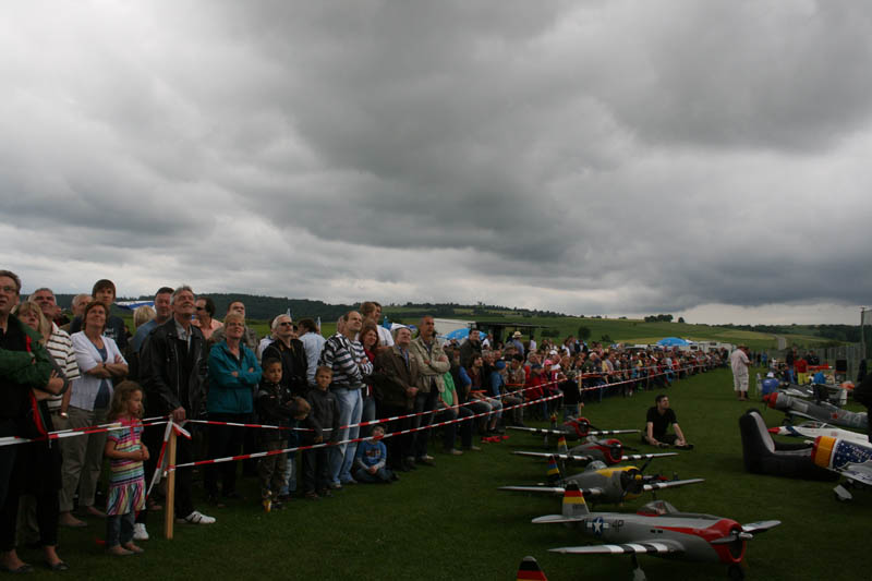 Noch vor der Pilotenbesprechung fing es erneut an zu Regnen. Der Aufbau der Modelle verzögerte sich dadurch. Das geduldige Publikum harrte derweil aus. Um 11:30 Uhr konnte dann begonnen werden. Einer der ersten Höhepunkte war die P47 Staffel. Mit sechs Maschinen am Start beeindruckend. In Formation zogen sie ihre Bahnen durch den stark bewölkten Himmel. Weiter ging es mit Hubschraubervorführungen, Fallschirmspringern, Jets und Hotlinern.