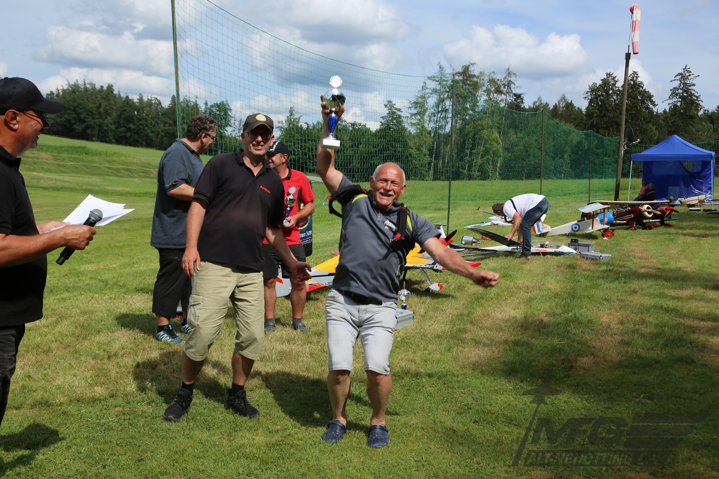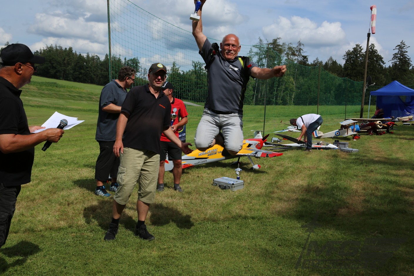 Die Siegerehrung für die meist angereisten Piloten ging natürlich wieder an unseren Verein. Richards Freudensprung zeigt es mehr als deutlich. Gefolgt wurden wir, in reichlichem Abstand von den Modellfliegern aus Egglkofen und dann vom Massinger Verein.