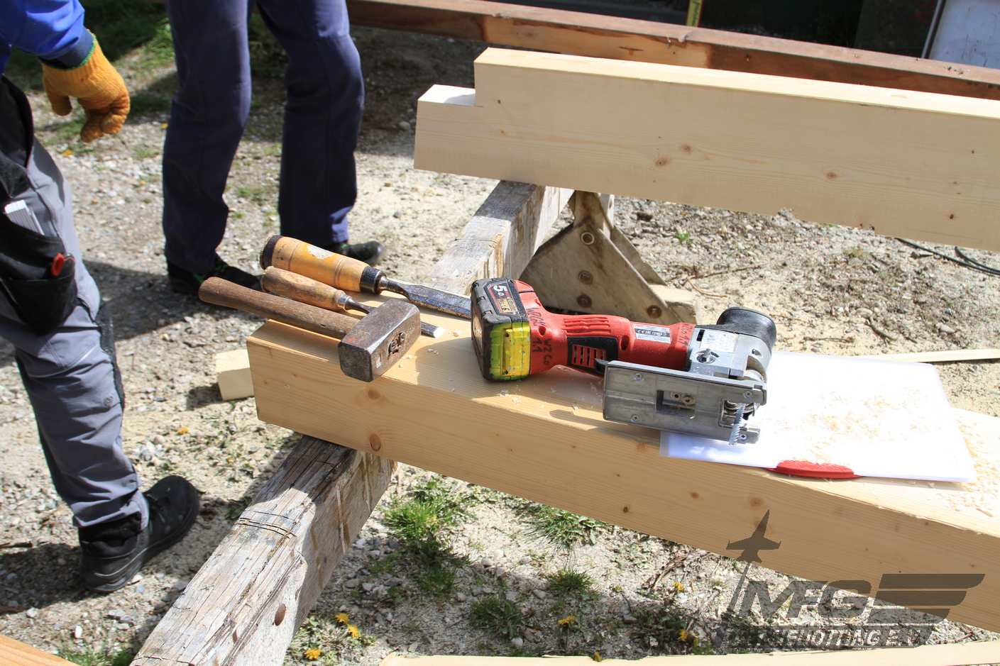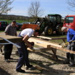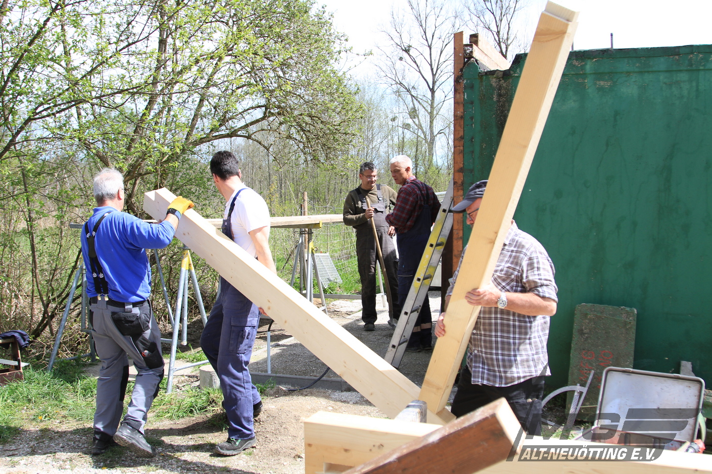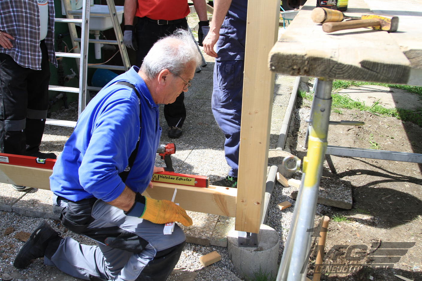 Ein großer Brocken war der Anbau der Gerätehalle. Akribisch, wie es sich für einen Zimmerermeister gehört, wurde die Grundkonstruktion vor Ort erstellt. So manch staunende Blicke auf die Vorgehensweise waren dem Team sicher.
