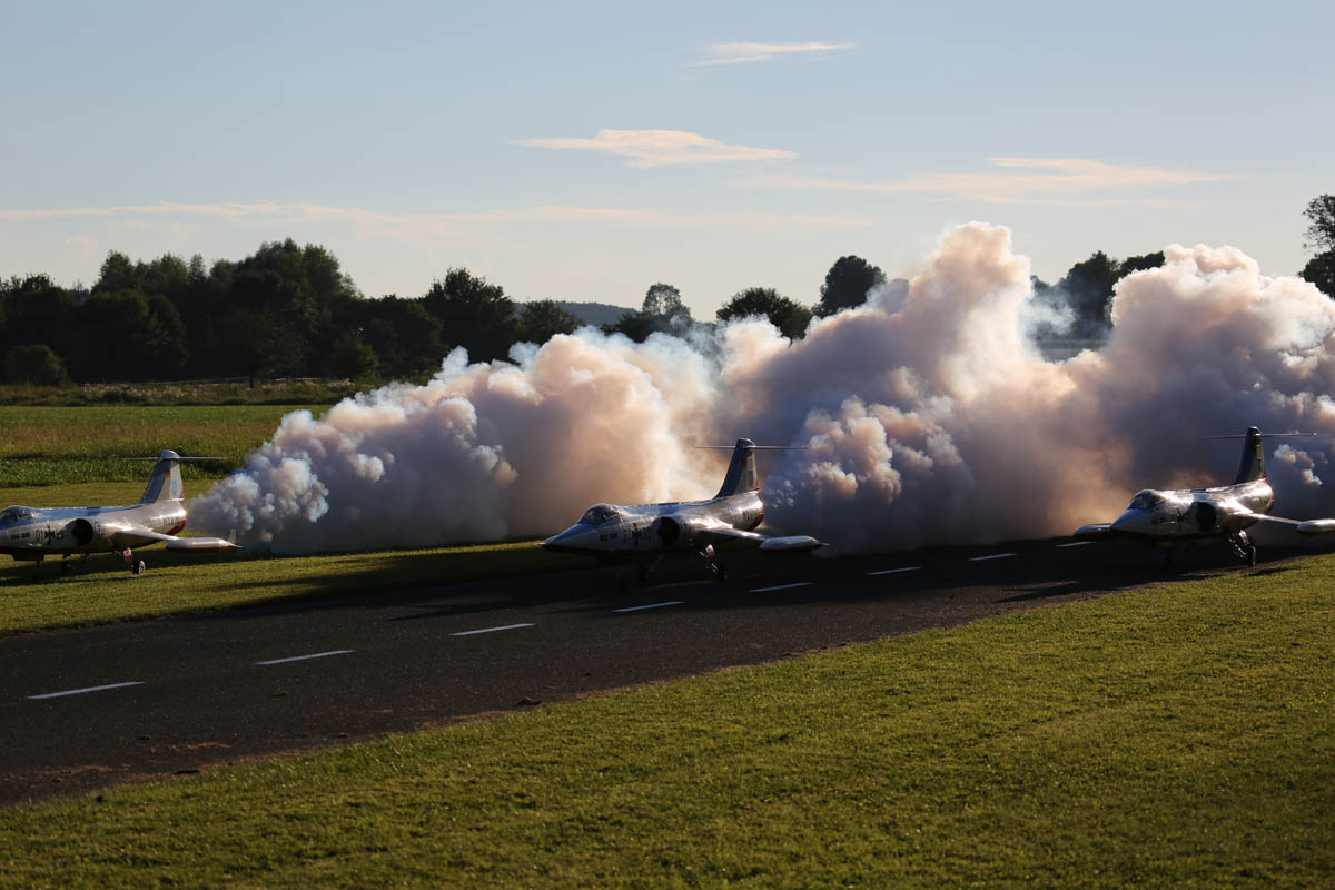 Eine besondere Flugschau zeigte das Red Bull-Team. Neben all den hervorragenden Piloten an diesem Wochenende konnte das Team durch ihren Synchronflug die Zuschauer in ihren Bann ziehen. Mit Doppeldeckern, natürlich im Red Bull Design zeichneten die Drei, teils mit Rauchanlage ihre Figuren in den tiefblauen Himmel. Höhepunkt war ihr „gezeichnetes“ Herz mit Amorpfeil. Eine große Verneigung an das Publikum welches dies auch mit lang anhaltendem Applaus würdigte. Damit ist die Vorführung von den Starfightern im Verbundflug aber nicht in den Hintergrund gerückt.