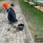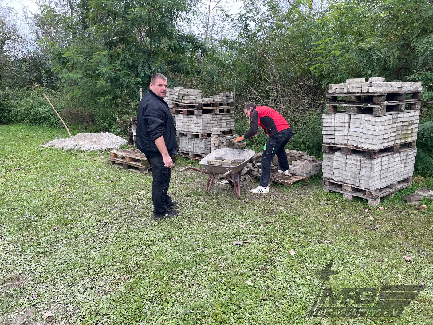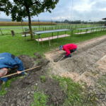 Gestärkt ging es dann an Rieselbett anlegen, Hundeknochen einsetzen und die Sondersteine zuschneiden, weiter. Drei Schubkarren Riesel fehlten noch zur Vollendung. Dank Thomas konnte die Lücke geschlossen werden, er hatte noch Riesel bei sich zu Hause.
