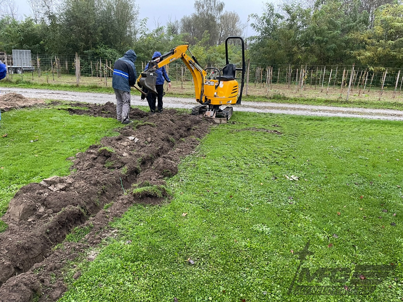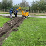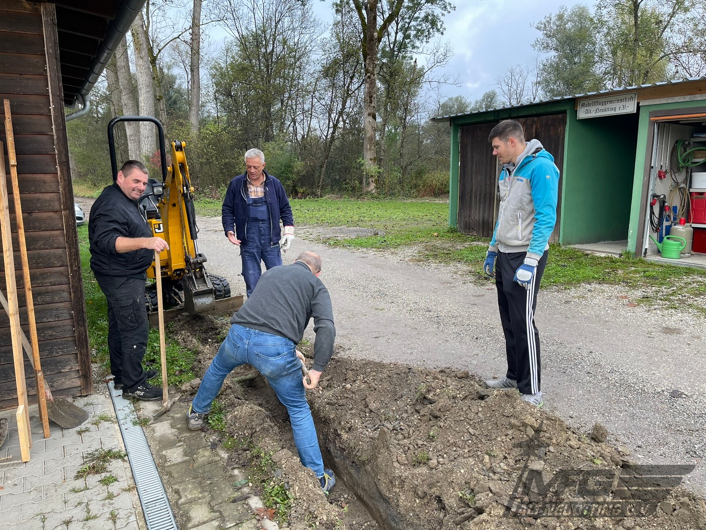 Der Samstag war dann auch deutlich freundlicher als der Vortag. Ab neun Uhr kamen dann auch die weiteren Mitglieder zur Baustelle. Gott sei Dank hatten wir mit Heinz einen geübteren Baggerbewältiger. Diesmal gingen diese Arbeiten zügiger voran. Der Anschluss der Leitungen an der Hütte wurden gekonnt freigelegt, die Kabel zu Sicherungskasten geführt und ein T-Stück zur Wasserversorgung eingebracht. Mit dem Aushub konnten dann auch gleich die kleinen Löcher im Zufahrtsweg gefüllt und verdichtet werden.