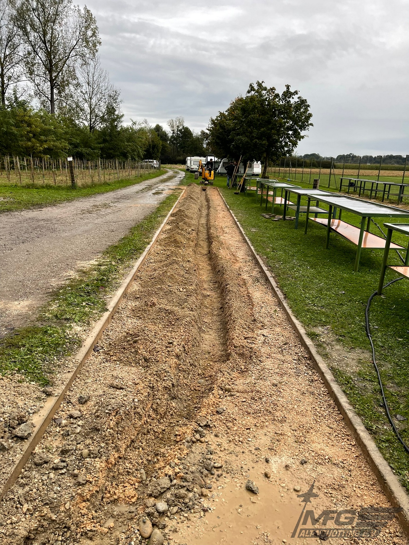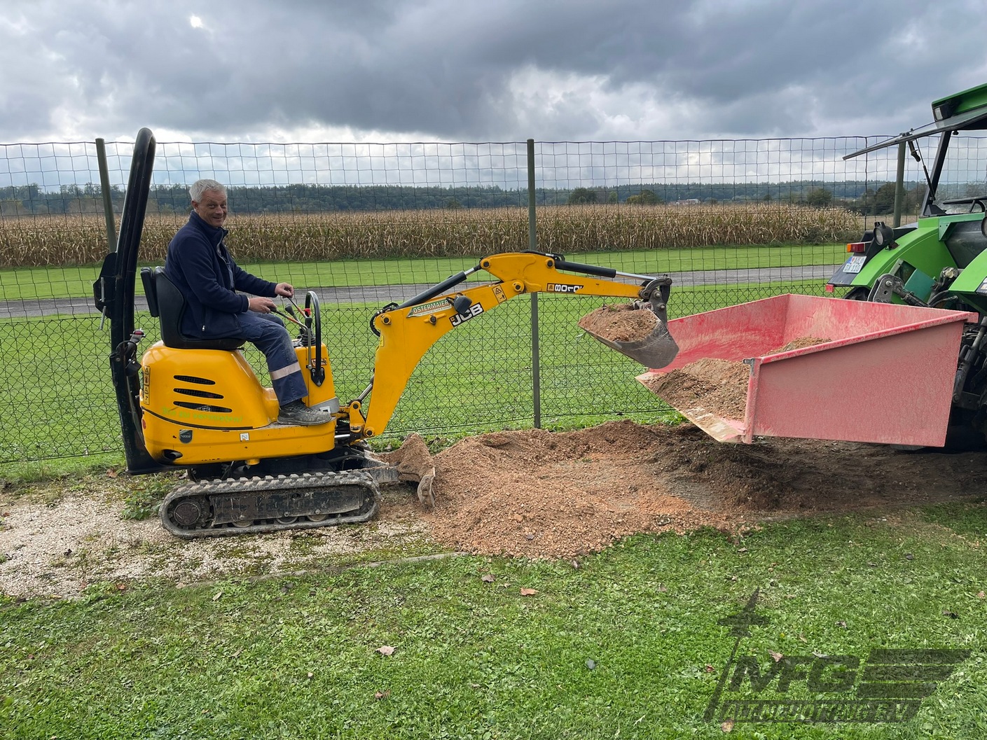 Also Bagger anwerfen und den Mist aus den Einfassungen nehmen. Thomas war wieder mit Traktor und Schaufel zur Stelle und wir (Werner, Charly, Günther und ich) schaufelten fleißig in die Mulde. Die stärkeren Regengüsse ließen wir aus! Am Ende des Tages war das große Feld mit Graben für Versorgungsleitungen ausgehoben. An dem gemütlichen Abend gingen aber bald die Lichter aus, geschafft fielen wir früh ins Bett.