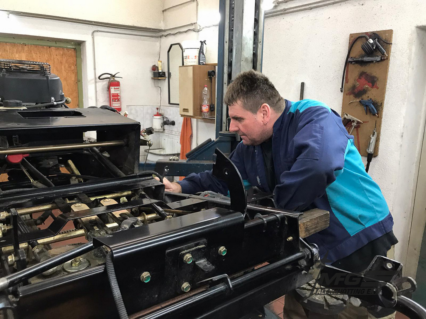 Wie geplant so getan! Charly und Werner transportierten den Traktor in die Werkstatt in der er dann von den Beiden, in alle Einzelteile zerlegt wurde. Alle ausgeschlagenen Teile wurden durch Neuteile ersetzt. Der Rahmen musste an verschiedenen Stellen verstärkt und geschweißt werden. Das Mähschild wurde einer Generalüberholung unterzogen.