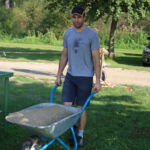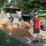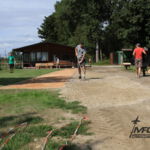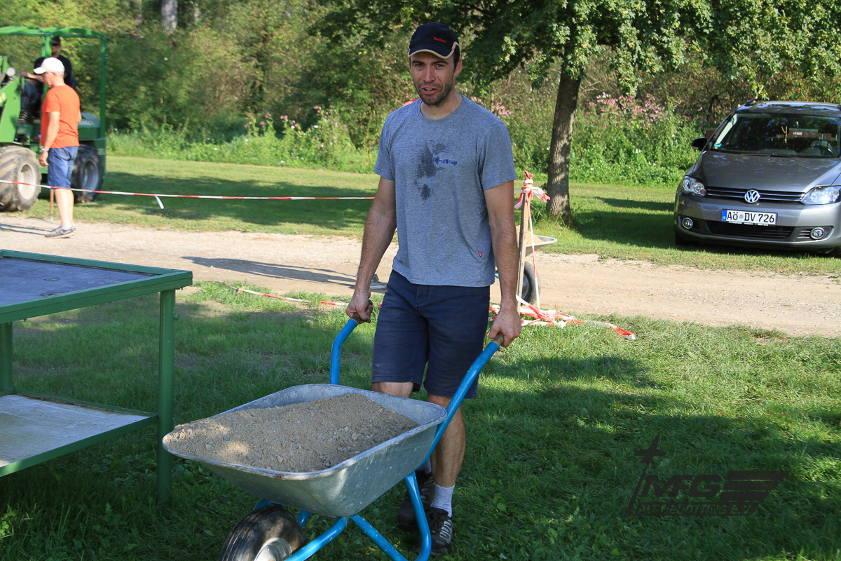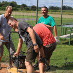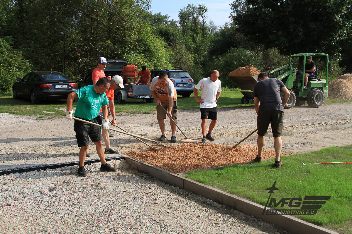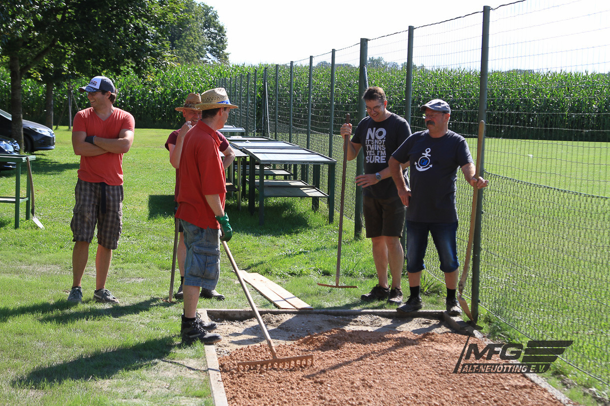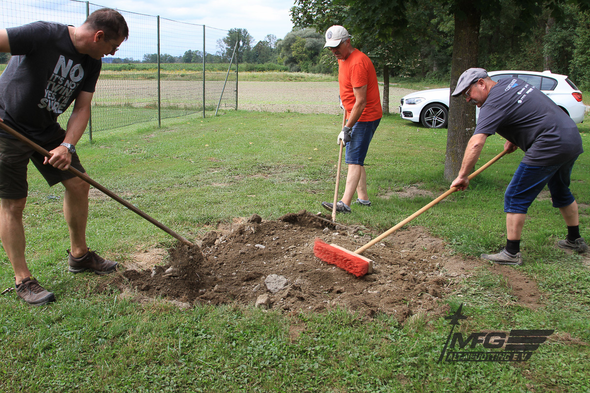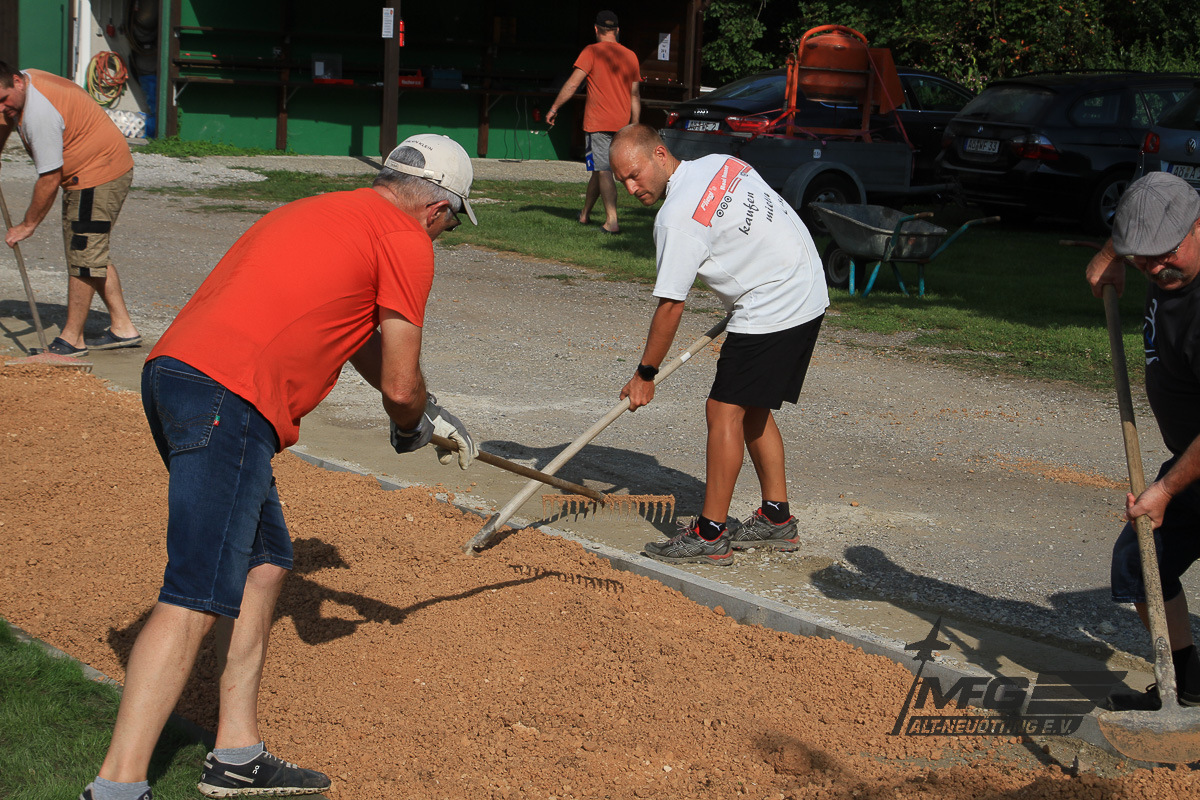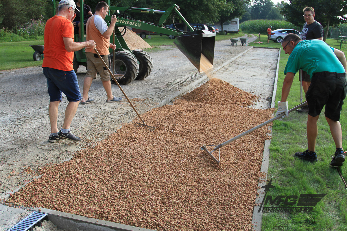 Dreizehn Kubikmeter Stauferkies waren von Parkplatz in die vorbereiteten Betten für die Vorbereitungstische zu verfrachten. Mit dreizehn fleißigen Helfern und dem entsprechenden Werkzeugen gingen die Arbeiten recht flott voran. Kies auffüllen, verdichten, weiterer Kiesschicht auftragen und wiederum verdichten. Letztlich waren die rund 35 Tonnen Kies mit Schubkaren und Lader an die richtigen Stellen gebracht.