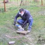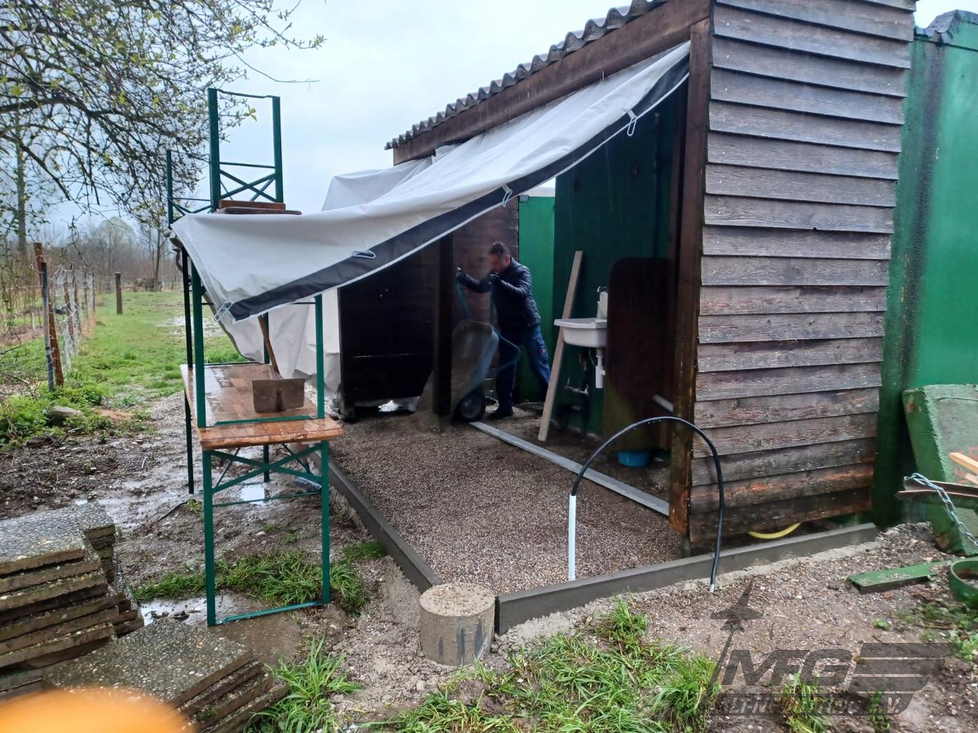Um wenigstens beim Plattenlegen einigermaßen „trocken“ arbeiten zu können bauten die beiden, einzigen Aktiven eine provisorische Überdachung auf. In gemeinsamer Abstimmung wurden die Platten auf Riesel verlegt. Mit schwerer Flex konnten die Platten millimetergenau zugeschnitten werden.